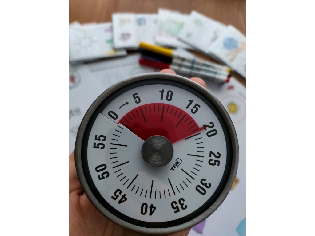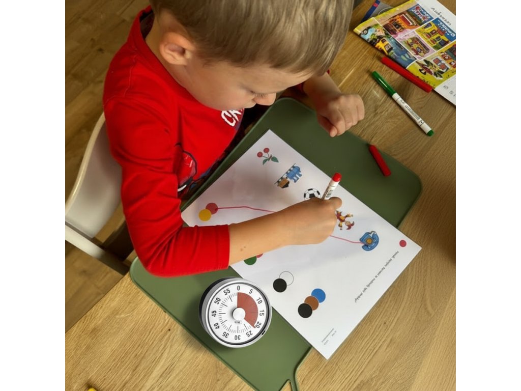 Tato mechanická minutka je skutečným pokladem pro rodiny a školy, které hledají efektivní pomůcky pro děti s autismem, dysfázií, ADHD nebo poruchami učení. Pokud se vaše dítě ještě neorientuje v čase, ale potřebuje vědět kolik času zbývá, tahle minutka to zvládne hravě. Zbývající čas se zobrazuje jako výrazné červené pole, které se postupně zmenšuje – dítě tak okamžitě vidí, jak čas ubíhá. To pomáhá budovat povědomí o čase bez složitých vysvětlení a snižuje frustraci z neočekávaných změn.
