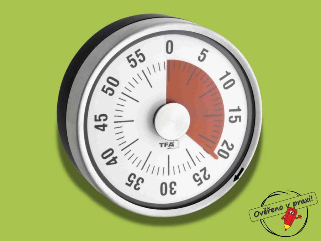 - Jednoduché použití kdekoli - nepotřebuje baterie. Jen otočíte a sledujete, jak červené pole mizí. Nastavit můžete 1 až 60 minut. To je perfektní pro krátké aktivity i delší čekání.