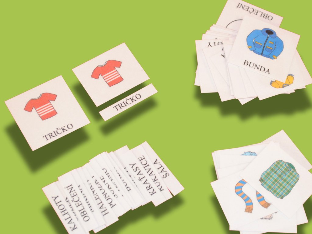 Balíček obsahuje k jednomu slovu vždy 1 kartu s obrázkem (4x5 cm), 1 kartu s obrázkem a textem (5x5 cm) a 1 kartu pouze se slovem (1x5cm).